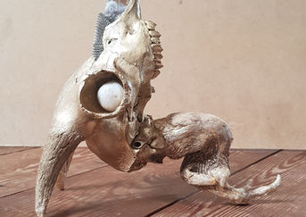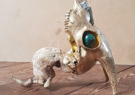 Material : Baby Goat Skull (Maui), Driftwood (Maui), Metal Mesh, Clay, Semi precious stones (Agate, Dragon Stone, Quartz), 24k Gold Leaf